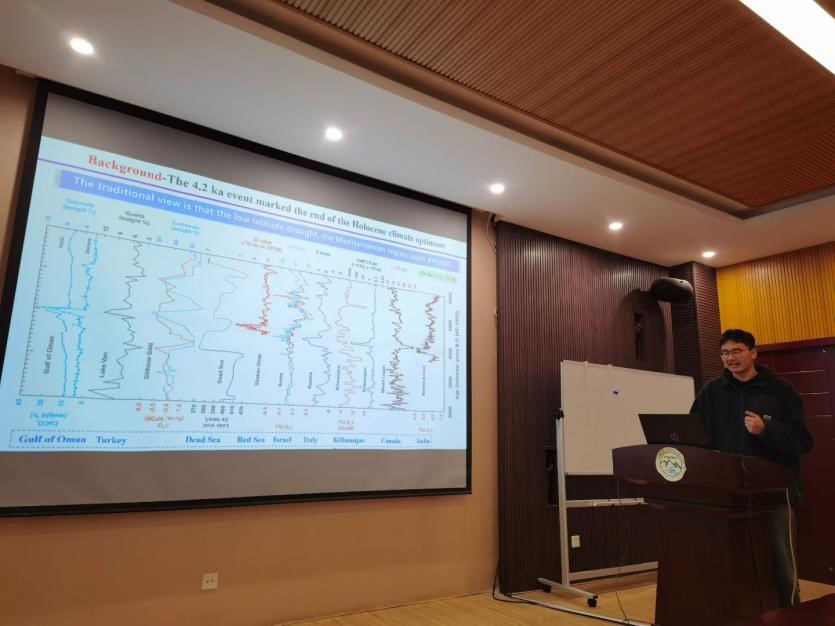 图3 博士生尹兴达同学就“亚洲季风区4.2 ka事件气候特征及驱动机制”进行汇报