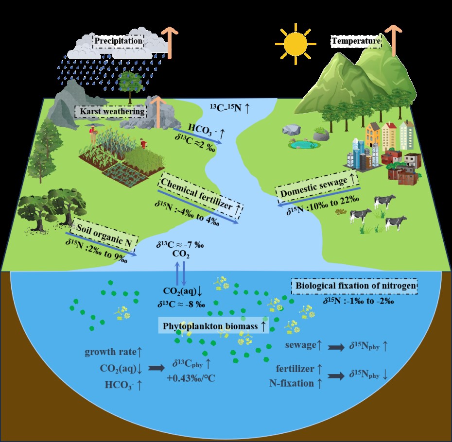 研究表明,浮游植物碳同位素分馏受生长速率和无机碳库变化的双重驱动,对温度表现出显著敏感性(+0.43‰/℃),并呈现季风调节的季节性模式。气候变暖可能增强湖泊有机质中13C富集效应,进而重塑气候变化下的元素碳分配格局。浮游植物氮同位素特征对流域城市化(以人口密度和建成区面积为表征)表现出非线性响应,其与流域土壤氮同位素基准值的偏差可有效追踪人为氮源(如15N贫化的农业肥料与15N富集的污水输入)。预计气候变暖与城市化的加剧将进一步放大湖泊碳氮耦合中的双同位素(13C和15N)印记。尤为关键的是,13C和15N同位素的同步富集会提升初级营养级的同位素基准信号,同时通过零点能效应降低食物链能量传递效率。上述同位素介导的动态过程不仅揭示了气候与人类活动之间的协同作用机制,更构建了一套兼具诊断功能与决策支持价值的同位素技术工具包,为脆弱高原生态系统的碳氮耦合诊断及适应性流域治理提供了科学依据。