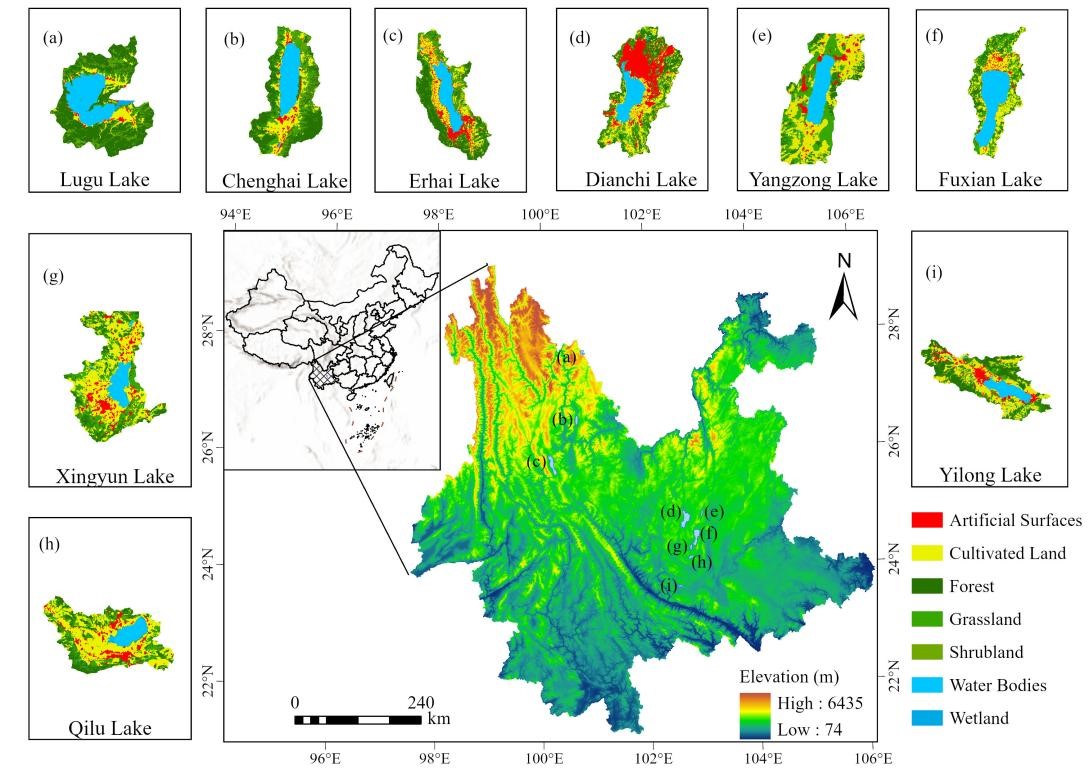 Fig. 2 Location and land use types of nine plateau lake basins in Yunnan