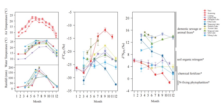 作为湖泊生态系统中的初级生产者,浮游植物在水生碳氮循环中扮演着关键角色,其稳定同位素特征(如碳、氮同位素)成为记录气候波动与人类活动对生物地球化学过程影响的敏感示踪剂。基于对云南九大高原湖泊浮游植物碳氮同位素特征(2017-2022年)的系统分析,本研究揭示了耦合环境胁迫下(如气候变暖与人类活动叠加)的差异化调控机制,为理解高原湖泊生态系统的响应与适应提供了科学依据。