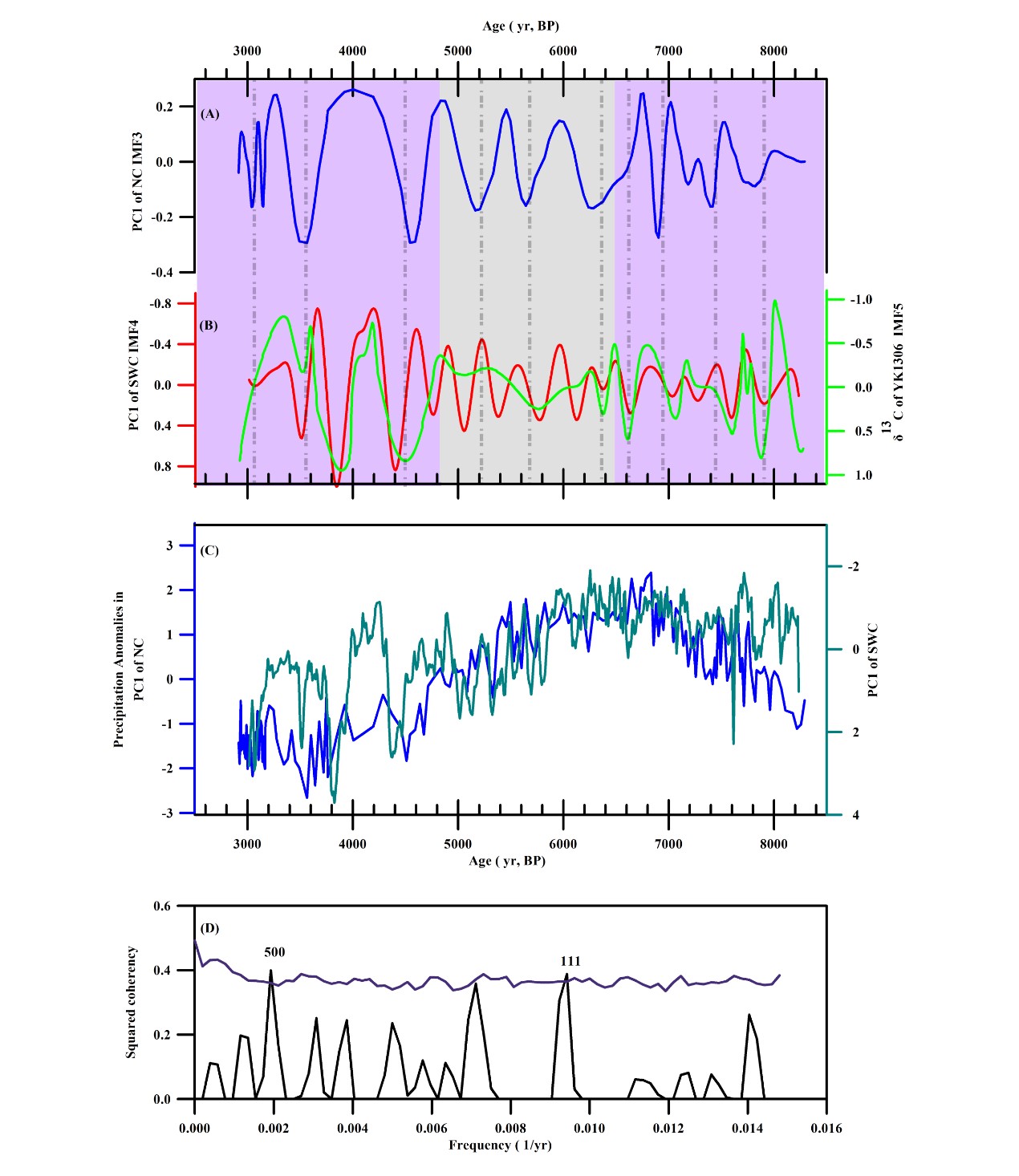 图1 中国北方与西南地区降水异常对比。(A)和(C)蓝线表示中国北方降水异常,其中NC的PC1(解释方差76%)为公海与小龙湾记录的PC1,IMF3为NC的PC1百年际尺度分量;(B) IMF5为YK1306石笋δ13C的百年尺度分量,IMF4为SWC的PC1百年尺度分量;(C) NC与SWC的PC1分别表征中国北方和西南地区水文气候变化;(D) 中国北方与中国西南PC1降水异常的交叉谱分析。