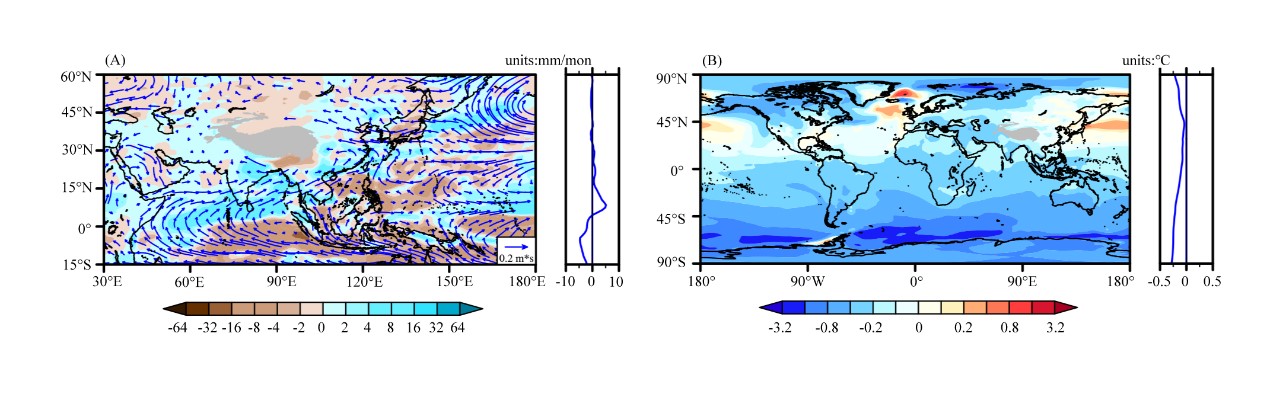 图2. HadGEM3-GC3.1模式对南大洋淡水输入的响应结果。(A)年降水异常(填色)与850 hPa风场异常(蓝色箭头);(B)全球地表温度异常,右侧子图显示纬向平均地表温度异常。