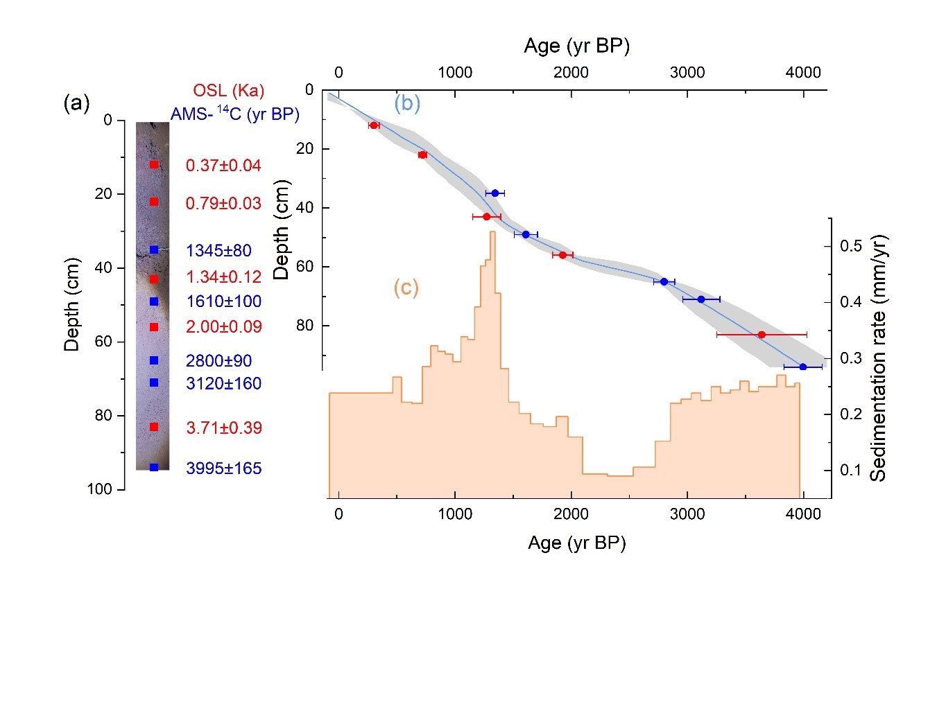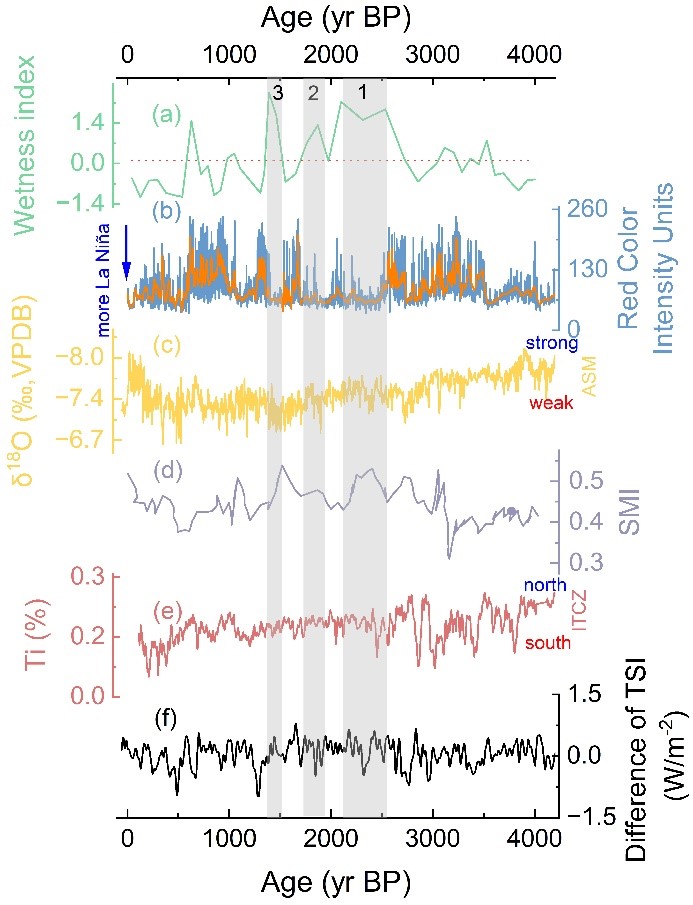 研究以云南董家洞洞穴粉砂沉积物为对象,综合采用单颗粒石英光释光(OSL)测年、AMS-14C测年和230Th测年方法,建立了约4000年以来的沉积年代序列。结果表明,AMS-14C与OSL测年结果总体一致,而由于样品黏土含量高、232Th浓度偏高,230Th测年结果不可靠;这说明单颗粒石英OSL方法可为洞穴粉砂沉积物提供可靠年代框架。在此基础上,研究结合粒度端元分析、地球化学元素主成分分析及综合湿润指数,识别出晚全新世中国西南地区三个相对湿润阶段,即2700—2100 yr BP、1900—1700 yr BP和1500—1400 yr BP。进一步对比区域石笋、湖泊等多种古气候记录发现,该洞穴粉砂沉积物记录与夏季风强弱和水文变化具有较好一致性,表明其能够有效指示区域湿干演变。研究还指出,晚全新世以来中国西南地区水文气候变化受太阳辐射、ITCZ南北移动和ENSO活动等多因素共同控制;其中约1500 yr BP以来,人类活动显著增强,逐渐成为影响区域环境变化的重要因素。相关成果发表于国际期刊 Palaeogeography, Palaeoclimatology, Palaeoecology